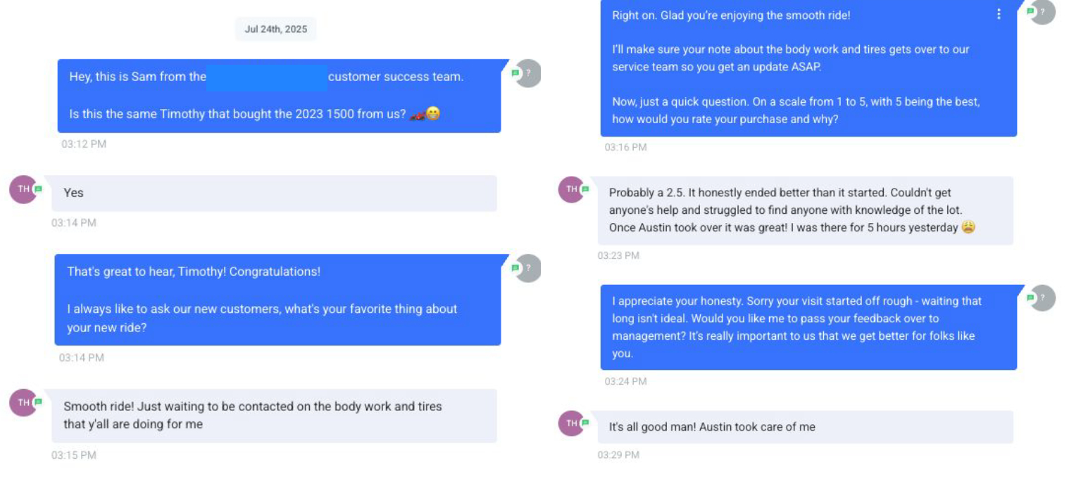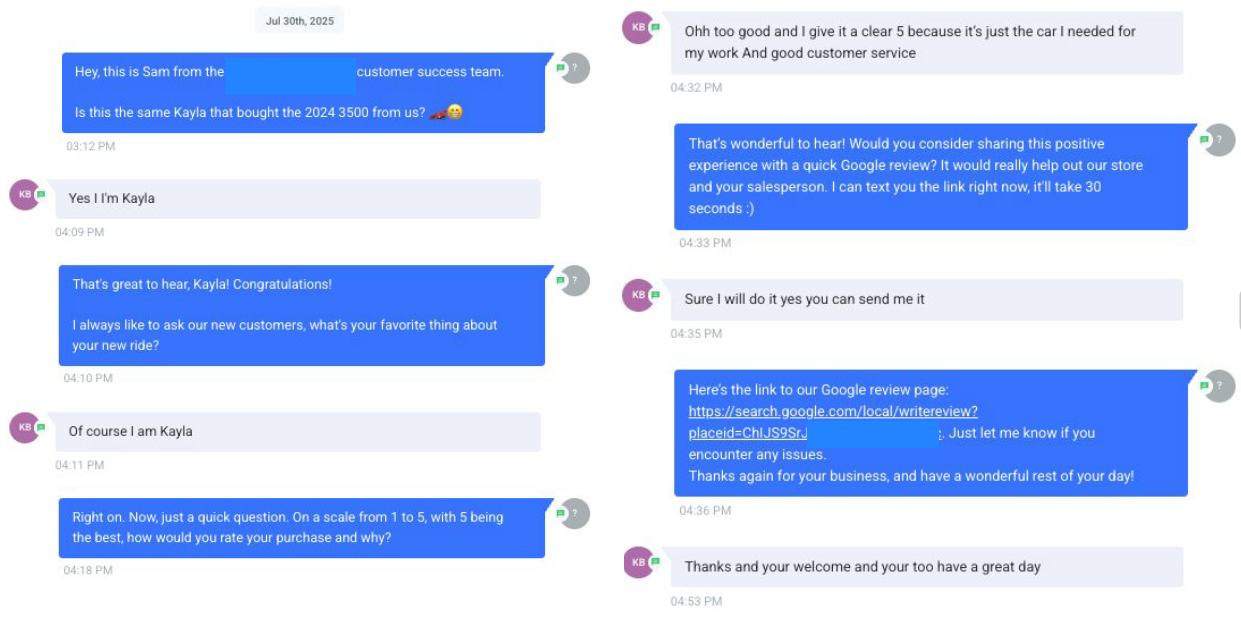 The AI uses natural, conversational language and focuses on understanding their experience rather than pushing for reviews. Customers appreciate being heard, and the conversations feel like genuine customer service follow-up.